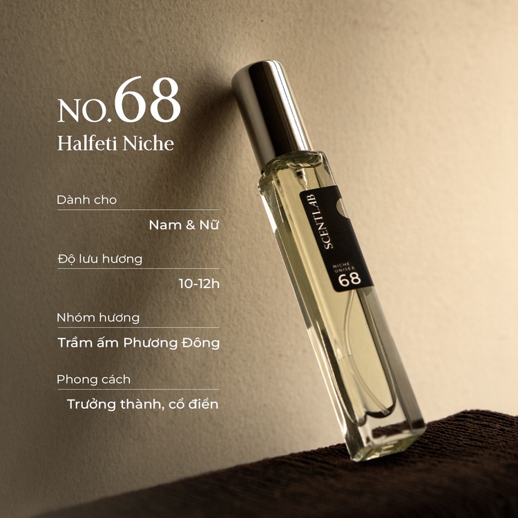 HALFETI NICHE NO. 68 thuộc nhóm hương Trầm ấm Phương Đông mang theo hơi thở ấm áp của Đàn Hương, Hổ Phách, Vani và Hoắc Hương tạo cảm giác chững chạc và sâu lắng. Cùng với sự phong phú của nhóm Cam chanh đã tạo nên mùi hương quyến rũ và cá tính vô cùng. Sự ấm áp bỗng hoá dịu dàng nhờ vào sự kết hợp của các Hương hoa hỗn hợp mang đến cảm giác say mê, nồng nàn.