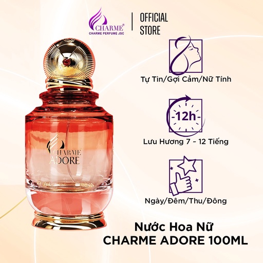 - Nhắc đến những sản phẩm tôn vinh nét đẹp của người phụ nữ mà không có mặt Nước hoa thơm lâu Charme Adore thì thật sự là một thiếu sót rất lớn, mùi hương của nó là sự lan tỏa mạnh mẽ, kích động các giác quan một cách tối đa