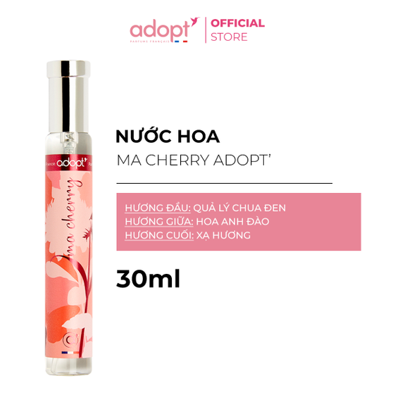 - Nước hoa nữ Adopt' Ma Cherry - Những ngày hè tươi sáng. Nước hoa Ma Cherry khởi đầu với hương thơm chua nhẹ của quả lý chua đen pha chút dịu êm của hoa anh đào tựa như hồi ức của thanh xuân rực rỡ tươi đẹp, mùi hương dần chuyển tinh tế hơn, sang trọng hơn khi kết hợp xạ hương.