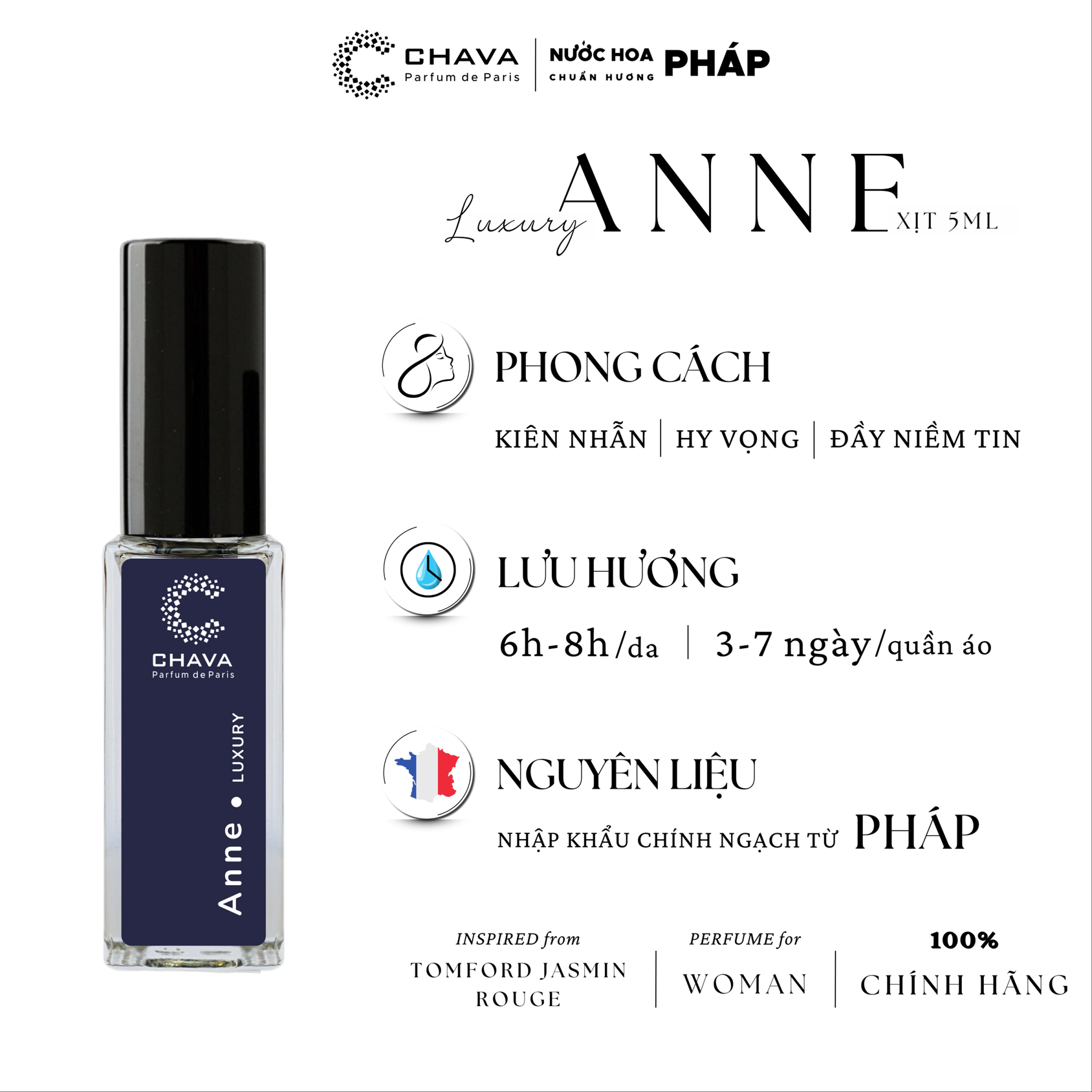 - Chava Luxury Anne là mang sắc hương nở rộ của một khu vườn hoa, chính xác thì sản phẩm thuộc nhóm hương hoa phổ biến, thêm phần ấm áp nhờ vào các hương phụ là gia vị cùng gỗ.
