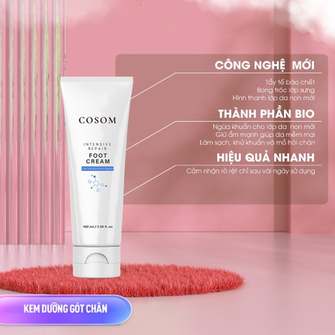 KEM DƯỠNG DA CHÂN COSOM INTENSIVE REPAIR FOOT CREAM CÔNG DỤNG: Giúp tăng cường độ đàng hồi, tái tạo làn da và cấp ẩm cho da. Giúp cho da chân luôn căng mịn, trắng hồng, giúp những phần da khô ráp trở nên mềm mại. Giúp bàn chân được cung cấp những dưỡng chất thiết yếu, mềm mại và mịn màng hơn. Cải thiện vùng da bị nứt nẻ, chai sần. CÁCH SỬ DỤNG: Lấy một lượng kem dưỡng da chân vừa đủ, thoa đều lên các vùng của da từ mu bàn chân đến gót chân, đồng thời thoa đều lên phần da trên cẳng chân Vừa thoa kem, vừa kết hợp các động tác massage, ấn nhẹ để dưỡng chất thẩm thấu và tăng sự đàn hồi da. THÀNH PHẦN: Xem trên vỏ hộp DUNG TÍCH: 100ML Thích hợp với mọi loại da