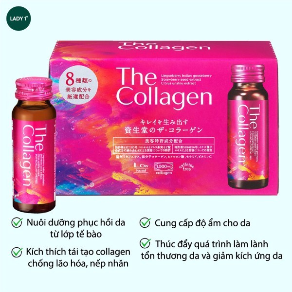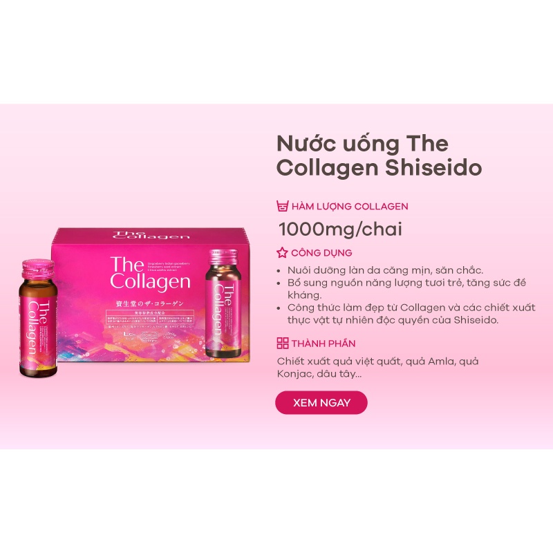 Nước Uống Đẹp Da The Collagen Shiseido Nhật Bản với thành phần chính là collagen và HA giúp cung cấp collagen cần thiết cho cơ thể, không chỉ làm đẹp da mà còn hỗ trợ tốt với xương khớp.
