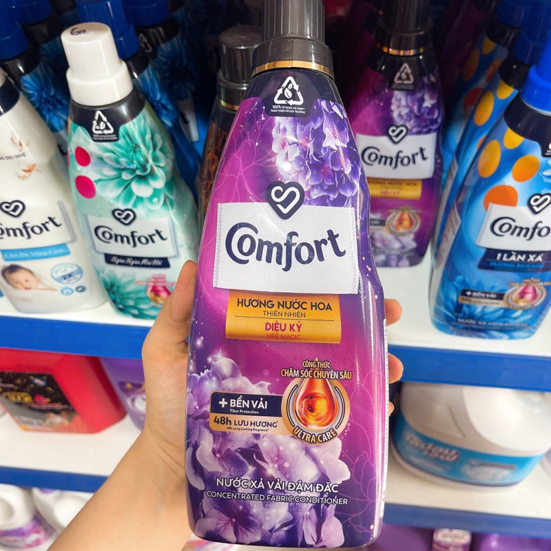 Hướng dẫn sử dụng: - Giặt tay: + Dùng 1/2 nắp cho 10-15 chiếc quần áo. + Hoà Comfort đậm đặc vào nước xả cuối, đảm bảo lượng nước vừa đủ ngập hết quần áo. + Ngâm quần áo 10-15 phút. Sau đó vắt và phơi khô. - Giặt máy: đổ Comfort đậm đặc vào ngăn chứa nước xả vải. Dùng 1 nắp cho một lần giặt thông thường. Điều chỉnh lượng dùng tuỳ vào số lượng và chất liệu quần áo.