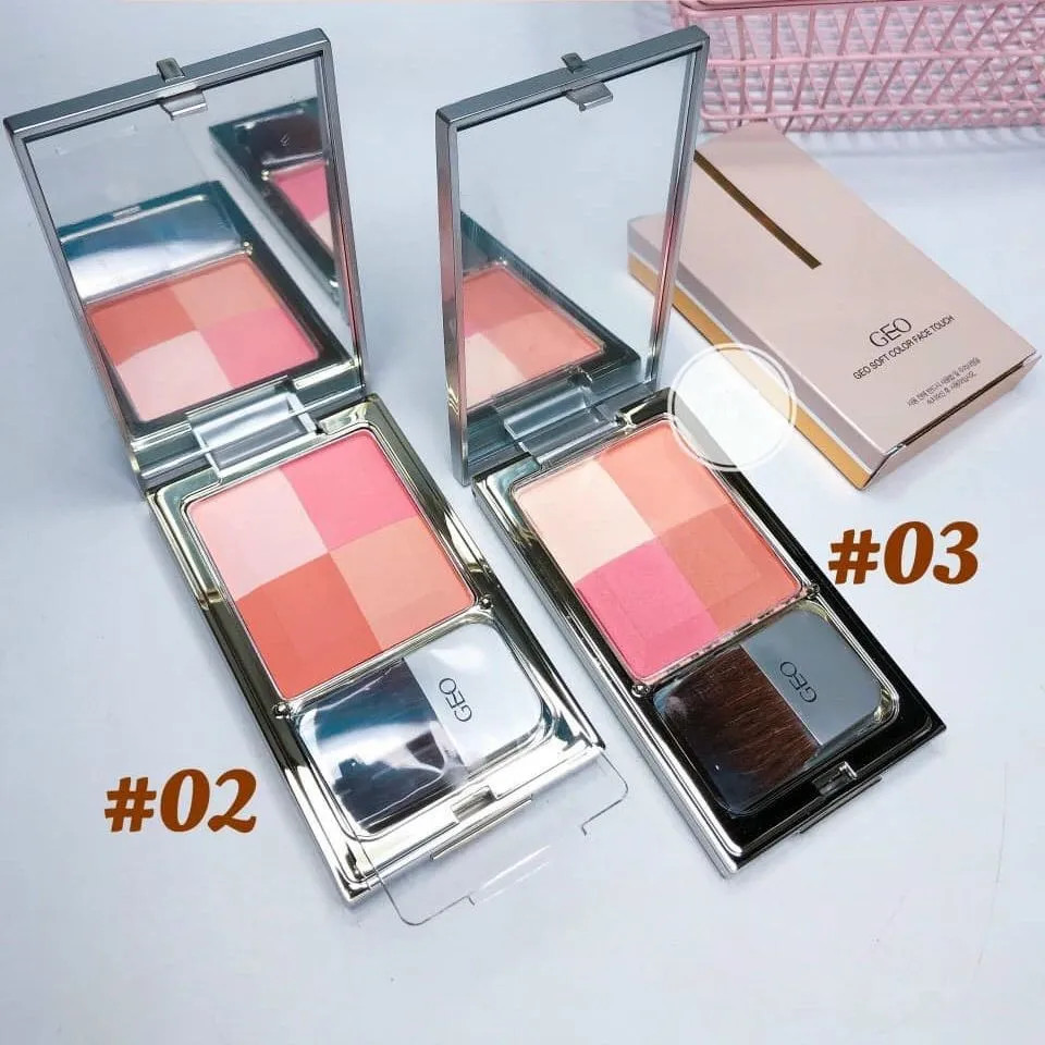 Phấn Má Hồng - Geo Soft Color Face Touch gồm có 4 ô màu trong 1 hộp, thêm nhiều sự lựa chọn cho bạn. Từ sắc hồng tự nhiên cho đến sắc cam, những tông màu thịnh hành của phấn má. Có thể sử dụng riêng rẽ hoặc kết hợp để cho những hiệu ứng cụ thể, chẳng hạn trộn 4 tông màu sẽ tạo ra 1 tông màu đặc biệt để trang điểm má và tạo điểm nhấn cho khuôn mặt hay trộn 2 ô một để có màu mix cam hồng đẹp tuyệt…
