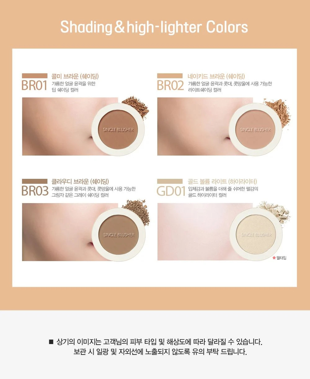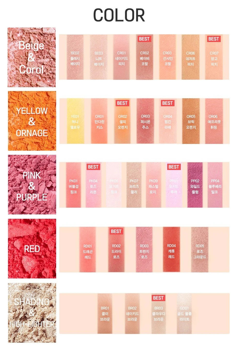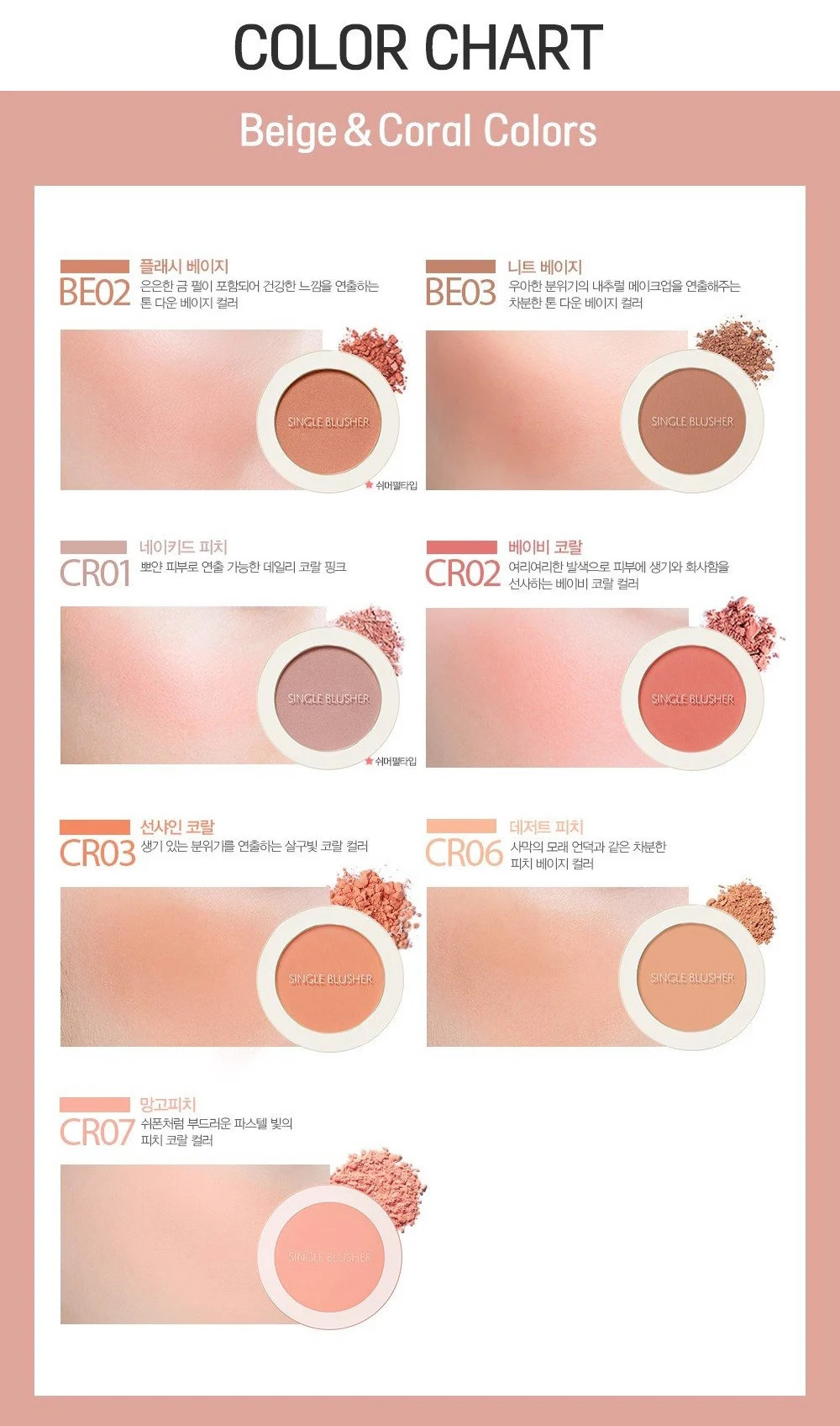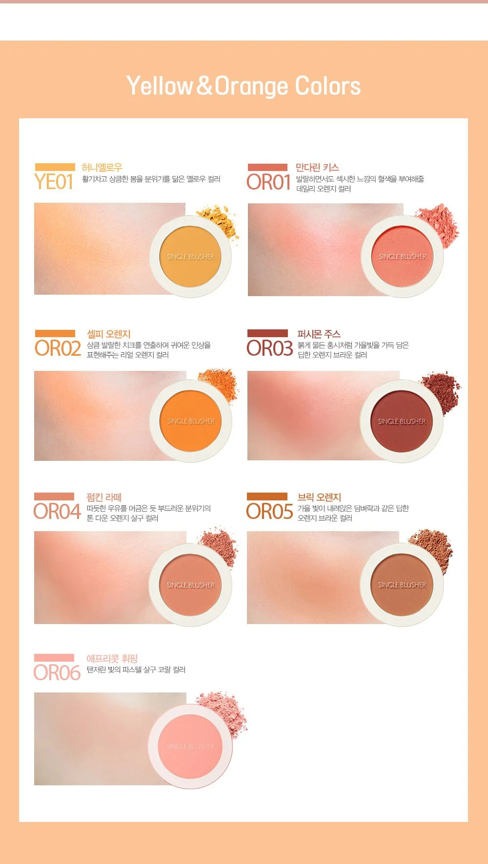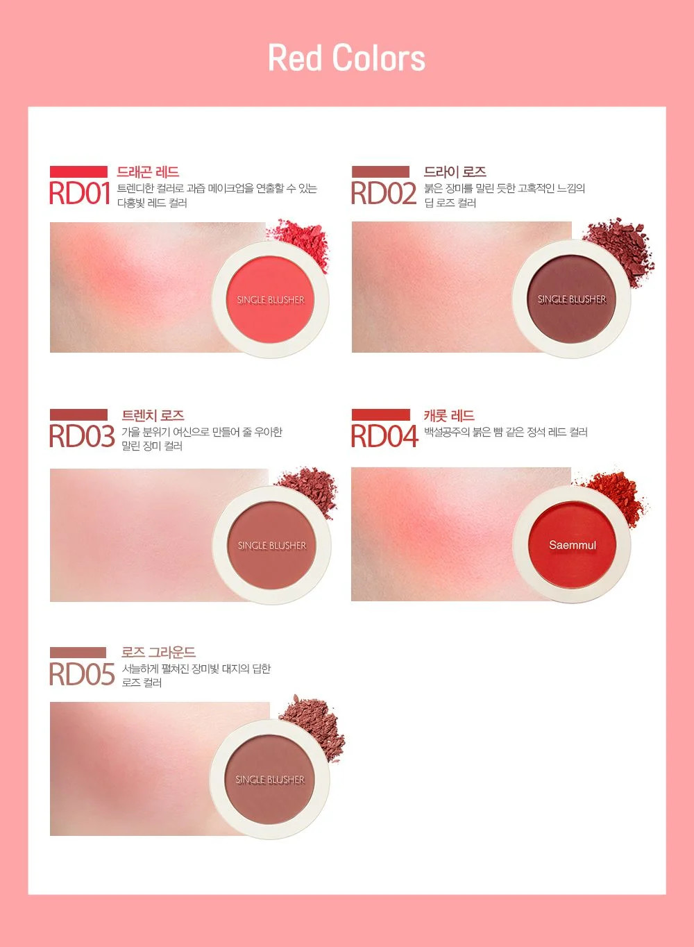 The Saem Single Blusher sở hữu những tone màu nổi bật, phù hợp với nhiều loại phong cách trang điểm, tạo nên lớp makeup hoàn hảo: