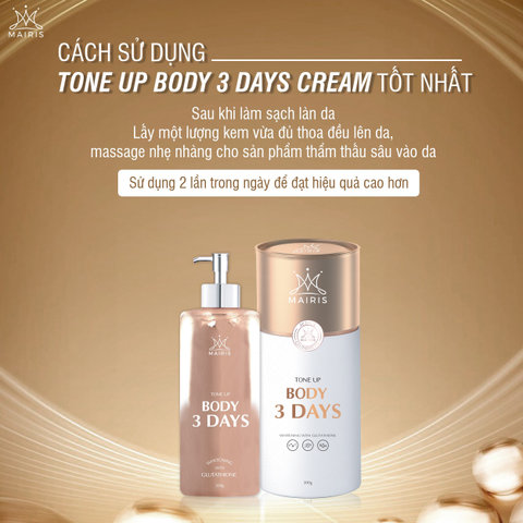 Dùng BODY 3 DAYS rất đơn giản, bạn chỉ cần làm sạch da. lấy một lượng kem vừa đủ thoa đều và massage nhẹ nhàng để kem thẩm thấu sâu vào da. Sử dụng ngày 2 lần sáng/tối để tăng hiệu quả dưỡng trắng.