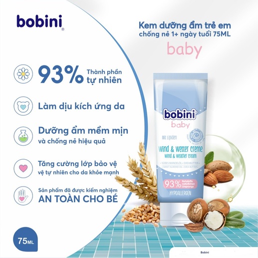 Kem dưỡng ẩm trẻ em Bobini Baby chống nẻ 1+ ngày tuổi giúp dưỡng da bé luôn mềm mịn. Công thức không gây dị ứng, giàu bơ hạt mỡ và dầu hạnh nhân bảo vệ da bé khỏi tác động từ môi trường. Thành phần Prebiotic cùng chiết xuất yến mạch có lợi và chất làm mềm tự nhiên giúp làm dịu vùng da kích ứng, bổ sung độ ẩm cho làn da mướt mịn.