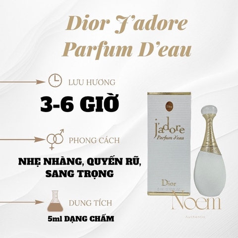 • Nước hoa J'adore Parfum D'eau EDP mang hương hoa tươi mát, đại diện cho sự phong phủ của hương hoa, gợi cảm và tươi mát. Chai nước hoa được miêu tả với hương thơm của Neroli từ Vallauris mang lại sự tươi mát sareng khoái, trong khi hương nắng của hoa nhài Ả Rập hòa quyện với hương mượt mà của hoa mộc lan Trung Quốc.