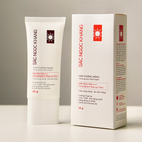 - Kem Chống Nắng 50g của Sắc Ngọc Khang được kết hợp với công nghệ ULTRAFINE UV TITAN, giúp tăng cường khả năng chống nắng hiệu quả và kéo dài (SPF 50/ PA ++++), đồng thời làm lớp lót trang điểm hoàn hảo và dưỡng da trắng sáng.