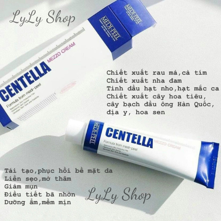 Kem Trị Mụn Phục Hồi Da Medi-Peel Centella Mezzo chiết xuất từ rau má được ưa chuộng tại Hàn và được nhiều chị em review 5 sao. Chất kem mịn, không quá lỏng cũng không quá đặc, dễ tán, khi apply lên da sẽ mát nhẹ, không gây nhờn rít hay bết dính. Mùi hương dược mỹ phẩm thơm dịu. Thành phần chiết xuất rau má, cà tím + các yếu tố tăng trưởng tế bào biểu bì EGF, peptide và các loại thảo mộc giúp làm tiêu nhân mụn. Kháng viêm, chống sưng tấy, đỏ da do mụn gây nên.