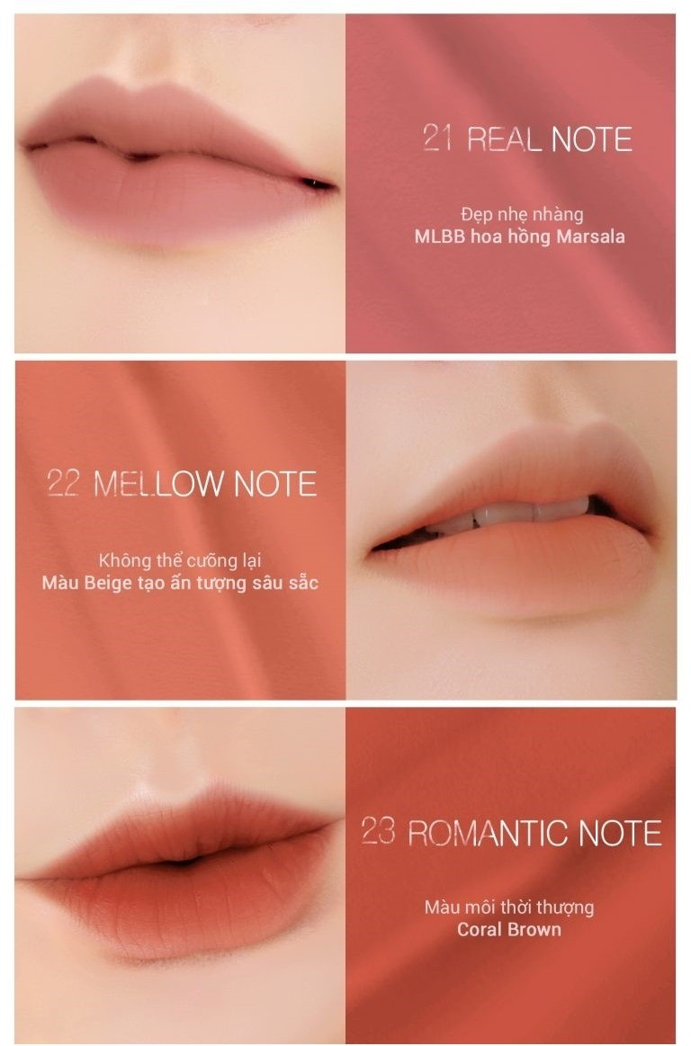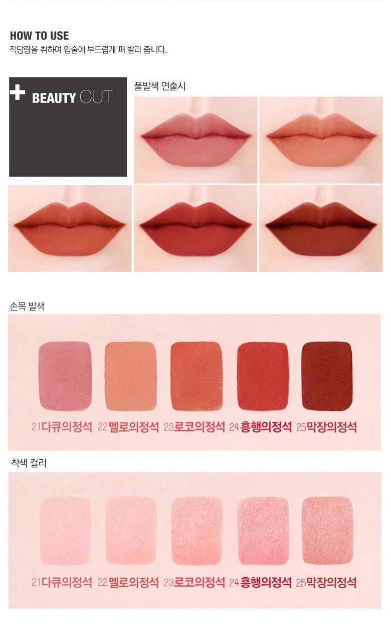 01: Extra Pure: Màu hồng baby 02: Extra Bounce: Màu đỏ cam 03: Extra Red: Màu đỏ hồng 04: Extra Mood: Màu đỏ gạch 05: Extra Force: Màu tím hồng Hướng dẫn sử dụng Son kem Bbia Last Velvet Lip Tint : Bước 1: Làm sạch Bước 2: dưỡng môi Bước 3: dùng cọ thoa son Son kem Bbia Last Velvet Lip Tint Ver1 hoặc ngón tay dậm đều lên môi.