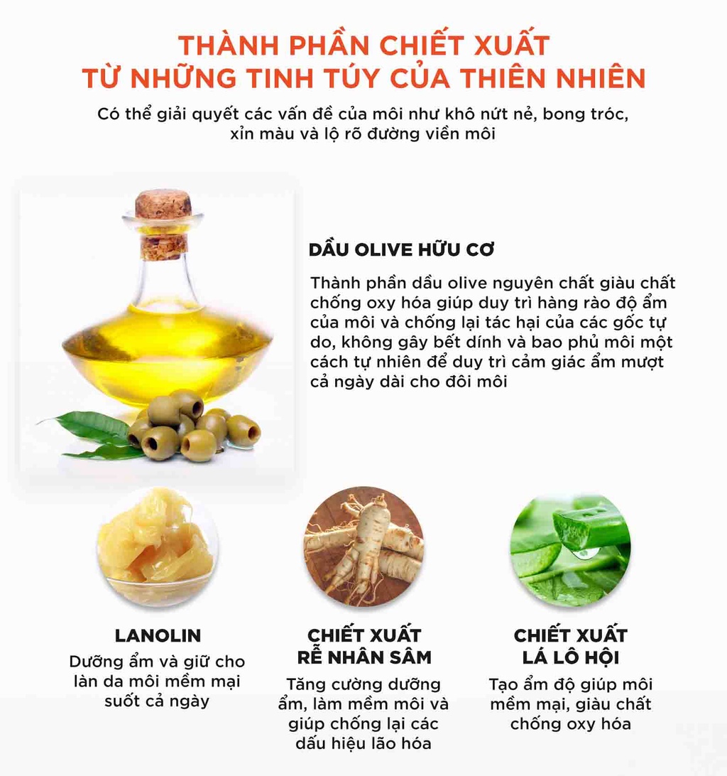Dầu olive hữu cơ: Thành phần dầu olive nguyên chất giàu chất chống oxy hóa giúp duy trì hàng rào độ ẩm của môi và chống lại tác hại của các gốc tự do, không gây bết dính và bao phủ môi một cách tự nhiên để duy trì cảm giác ẩm mượt cả ngày dài cho đôi môi.