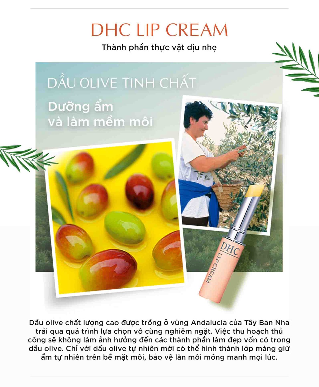 Thành phần đặc biệt nhất của son dưỡng olive DHC là dầu olive chất lượng cao được trồng ở vùng Andalucia của Tây Ban Nha đã được trải qua quá trình lựa chọn vô cùng nghiêm ngặt. Việc thu hoạch thủ công sẽ không làm ảnh hưởng đến các thành phần làm đẹp vốn có trong dầu olive.