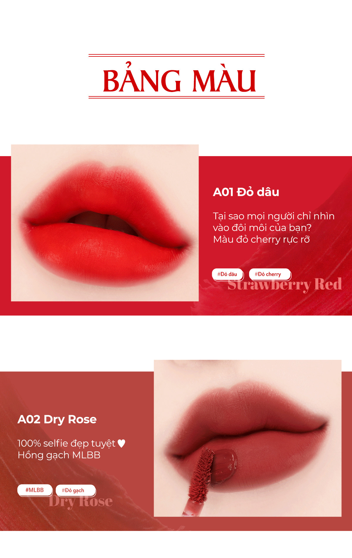 Black Rouge Air Fit Velvet Tint (The Red) là bộ sưu tập đầu tiên của dòng son kem đình đám đến từ Black Rouge Hàn Quốc. 7 màu sắc thời thượng hòa cùng xu hướng trang điểm ấn tượng đang cực kì thịnh hành trong thời gian gần đây, mang đến cho các cô gái nét cuốn hút khó cưỡng.