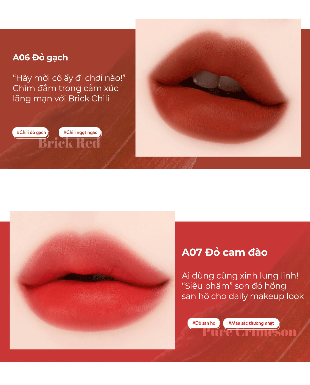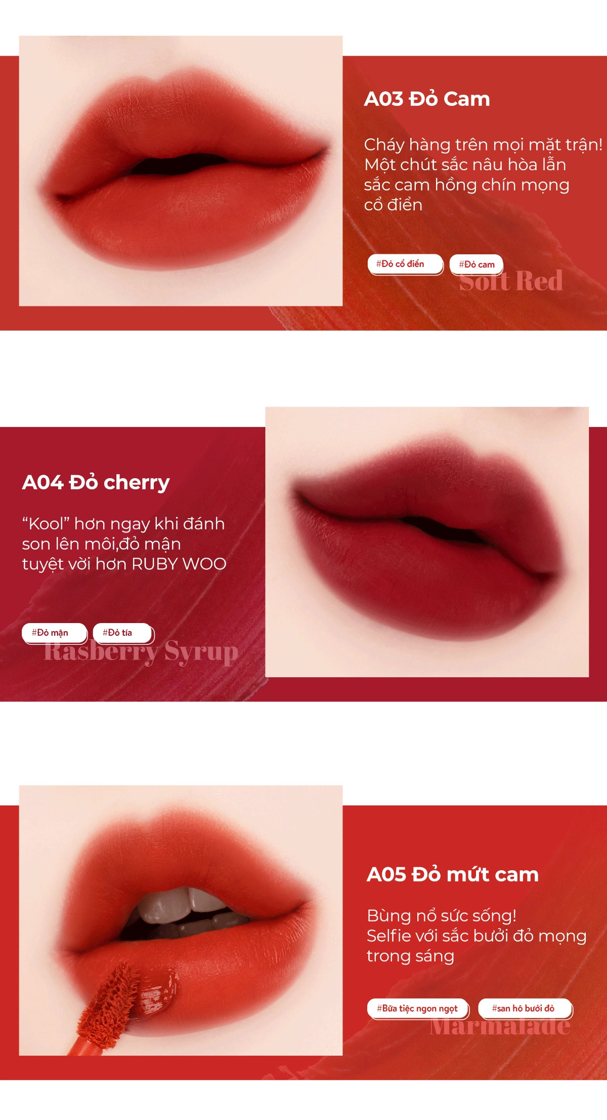 Bạn có thể phối các cây son Air Fit Velvet Tint với nhau hoặc phối với màu của dòng son khác để cho ra màu sắc của riêng bạn.