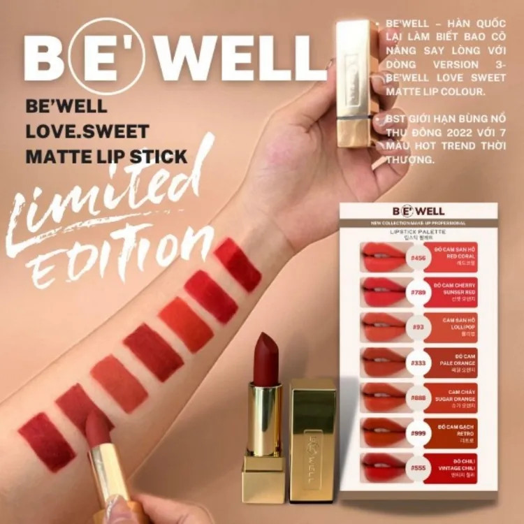 - Nói đến son lì thì có lẽ dòng son Be'wel chính là cái tên không còn xa lạ nữa. Tiếp nối sự thành công của son Be'well hãng Be'well – Hàn Quốc lại làm biết bao cô nàng say lòng với dòng Be’Well Love Sweet Matte Lip Stick.