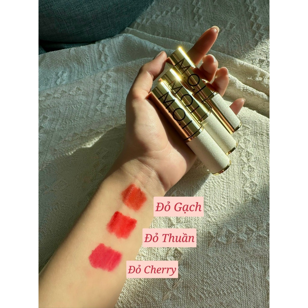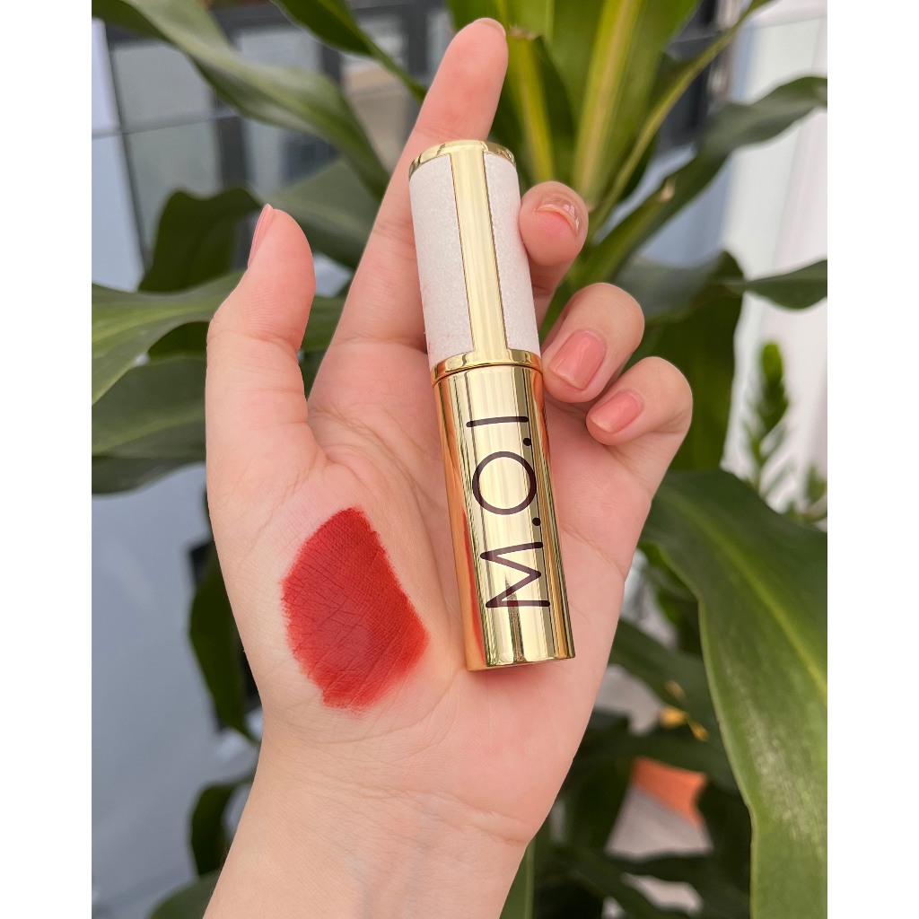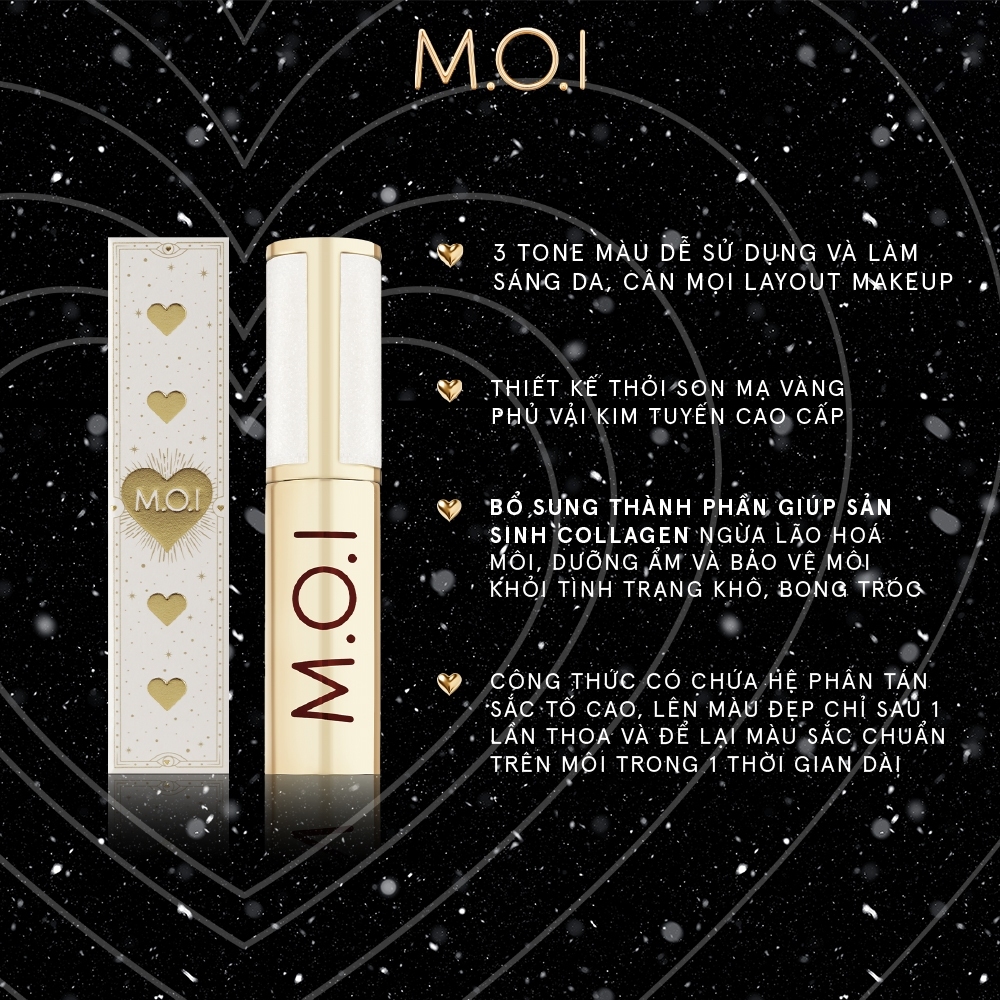 Son kem M.O.I phiên bản mùa lễ hội với thiết kế thỏi son mạ vàng phủ vải kim tuyến cao cấp kiêu sa toát lên nét đặc trưng của mùa lễ hội cuối năm. Không chỉ bổ sung Collagen ngừa lão hóa, dưỡng ẩm và bảo vệ môi khỏi tình trạng khô, bong tróc mà còn tăng điểm nhấn cho lớp trang điểm bởi 3 tông son đỏ quyến rũ và must-have trong các bữa tiệc