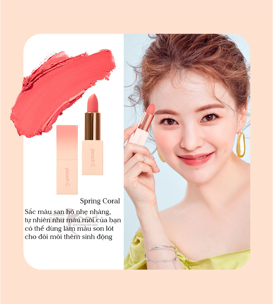 + Spring Coral: Tone màu coral nhẹ nhàng, tự nhiên, phù hợp cho những bạn thích màu son tự nhiên.