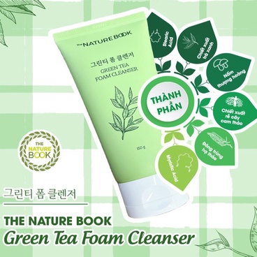 - Sữa rửa mặt trà xanh The Nature Book được chiết xuất từ những búp trà non thiên nhiên được trồng tại Hàn Quốc. Đây là loại thực vật chứa nhiều dưỡng chất giúp dưỡng ẩm, giữ da mềm mại, đặc biệt là chống oxy hóa, mang lại làn da tươi trẻ, mịn màng. Sử dụng sản phẩm Sữa Rửa Mặt chiết xuất từ trà xanh của The Nature Book giúp cho làn da trở nên mềm mịn tươi sáng đồng thời những dấu hiệu lão hóa, những vết nám sạm chân chim sẽ hạn chế xuất hiện.