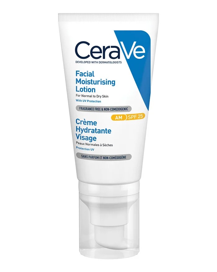 Dưỡng ẩm da mặt là một bước quan trọng của bất kỳ quy trình chăm sóc da buổi sáng nào và kem dưỡng ẩm có SPF phổ rộng rất quan trọng để giúp bảo vệ làn da khỏi tác hại của tia UVA và UVB. Để có tác dụng dưỡng ẩm` và khôi phục hàng rào độ ẩm của da, hãy tìm kiếm các sản phẩm có thành phần như hyaluronic-acid, niacinamide và ceramides cùng kết cấu mỏng nhẹ không gây mụn. Sữa dưỡng ẩm chuyên biệt ban ngày với SPF 25 từ CeraVe với 3 loại ceramide thiết yếu và axit hyaluronic giúp giữ ẩm, niacinamide giúp làm dịu da cùng với Công nghệ MVE độc quyền duy trì độ ẩm cần thiết cho da suốt 24h. Bên cạnh đó, với SPF 25 cung cấp khả năng chống nắng phổ rộng cùng công nghệ InVisibleZinc™ (zinc oxide vi lượng) giúp thoa đều dễ dàng. Sản phẩm không gây mụn, không làm tắc nghẽn lỗ chân lông và lý tưởng cho mọi loại da.