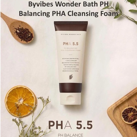 Sữa Rửa Mặt Byvibes Wonder Bath PHA 5.5 150ml đến từ thương hiệu chăm sóc da được yêu thích tại Hàn Quốc Wonder Bath. Sản phẩm có chứa 98% thành phần chiết xuất từ thiên nhiên. Trong đó, nổi bật là thành phần PHA, tên đầy đủ là Polyhydroxy Acids, giúp làm sạch da, tẩy tế bào chết dịu nhẹ, ít gây kích ứng và tổn thương da, dưỡng ẩm cho da căng bóng, mịn màng. Chiết xuất trà Phổ Nhĩ giúp làm mát da, đẩy lùi các dấu hiệu lão hóa, củng cố lớp hàng rào bảo vệ da. Dầu dừa và dầu cọ giúp cải thiện tình trạng mụn, giảm thâm nám, làm đều màu da, dưỡng ẩm tối ưu cho da.