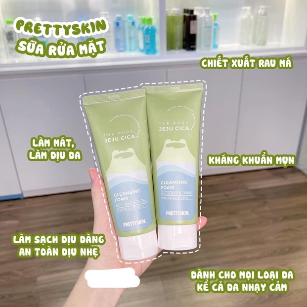 – Pretty Skin The Pure Jeju Cica Cleansing Foam với thành phần chiết xuất rau má từ đảo Jeju giúp làm sạch sâu, loại bỏ dầu thừa, bã nhờn đồng thời giúp làm dịu da, ngừa mụn, thích hợp trên cả làn da nhạy cảm.
