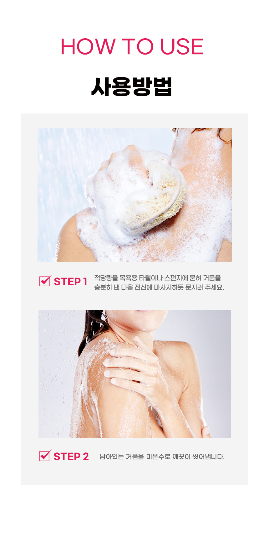 Cách dùng: Cho một lượng sữa tắm thích hợp lên khăn tắm, tạo bọt, mát xa toàn bộ cơ thể, sau đó tắm kỹ bằng nước sạch.