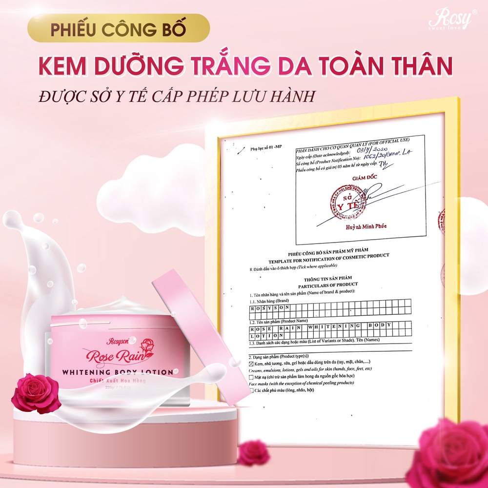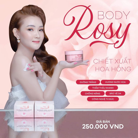 - Đảm bảo an toàn và phù hợp mọi loại da, kể cả da nhạy cảm. Kem Body Rosy giúp dưỡng trắng, giữ ẩm, chống lão hóa và chống nắng. Kem thấm nhanh không bết rít tạo cảm giác dễ chịu thoải mái cả ngày.
