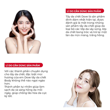 Tẩy da chết Dove là sản phẩm đình đám nhất hiện tại, được đánh giá là một trong những sản phẩm tẩy da chết giúp da loại bỏ các lớp da vảy sừng, lớp da chết bong tróc và trả lại một làn da mịn màng, trắng hồng. Với các thành phần chuyên dụng cho tẩy da chết, đặc biệt mùi hương của em Dove tẩy da chết Body không thể nào ngọt ngào hơn.