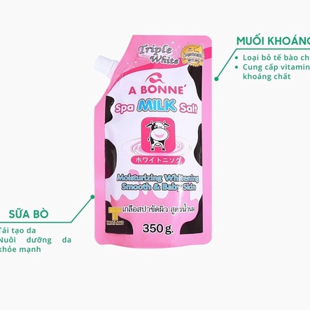 Muối tắm tẩy tế bào chết cơ thể, làm sáng da, dưỡng da mịn màng A Bonné Spa Milk Salt là tẩy tế bào chết body thuộc thương hiệu A Bonné đến từ Thái Lan. Cùng với các thành phần yogurt, vitamin C, tinh chất sữa bò cung cấp độ ẩm, nuôi dưỡng làn da mềm mại, hỗ trợ điều trị tình trạng mụn lưng cũng như viêm nang lông, cho bạn làn da hồng hào, trắng mịn rạng rỡ.