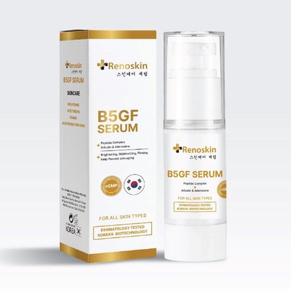 Renoskin B5GF chứa các yếu tố tăng trưởng, tế bào gốc Stemcell: EGF, FGF, IGF, VEGF Peptide các vitamin và dưỡng chất nuôi dưỡng và ức chế thâm và sạm da như Vitamin B5, Niacinamide, Arbutin, Allantoin, Adenosine, HA...