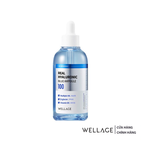 - Tinh chất Wellage Real Hyaluronic Blue Ampoule dưỡng ẩm sâu cho da mà không hề gây cảm cảm giác nhờn dính với khả năng hấp thụ độ ẩm cao nhờ 100% Axit Hyaluronic tinh khiết và đã loại bỏ các tạp chất khác.