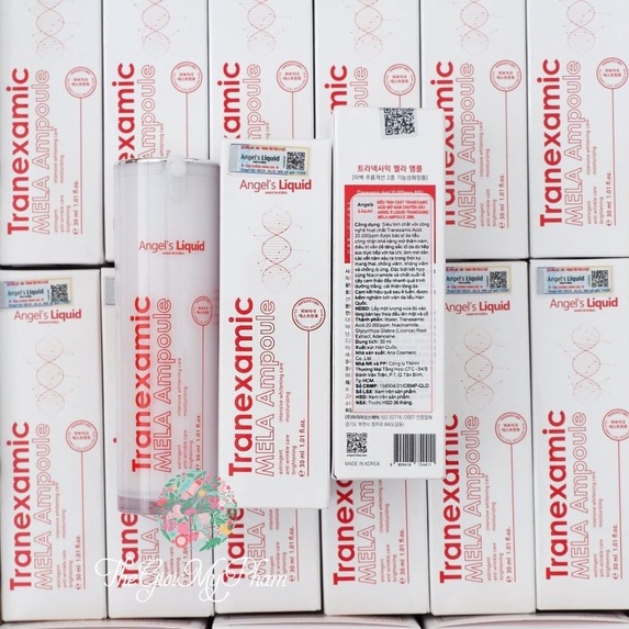 - Siêu Tinh Chất Xoá Thâm Đỏ, Mờ Sạm Nám Angel's Liquid Tranexamic Mela Ampoule 30ml hiện nay đã có mặt tại Thế Giới Skinfood chứa thành phần Tranexamic Acid 20,000ppm là hoạt chất được bác sĩ da liễu công nhận khả năng mờ thâm nám, điều trị vấn đề tăng sắc tố da do tiếp xúc trực tiếp với tia UV, ngoài ra còn giúp dưỡng sáng, làm đều màu da, làm mờ vết thâm sau mụn, giảm mẩn đỏ rõ rệt, làm mờ dần các vết nám xảy ra trong thời kỳ mang thai, chống viêm, kháng viêm và chống dị ứng, kích ứng cho da, bảo vệ và xoa dịu làn da bị tổn thương bởi các yếu tố gây hại từ môi trường như vi khuẩn bụi bẩn, nấm, phục hồi tổn thương da do tia UV có trong ánh nắng mặt trời gây ra.