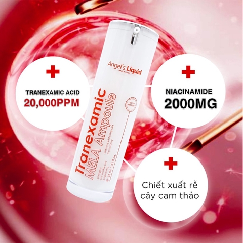 Siêu Tinh Chất Xoá Thâm Đỏ, Mờ Sạm Nám Angel's Liquid Tranexamic Mela Ampoule là tinh chất đến từ thương hiệu Angel's Liquid giúp mờ nám chuyên sâu, chống lại dấu hiệu lão hóa sớm của làn da, làm đầy các nếp nhăn hiệu quả, kích thích sản sinh collagen, tăng cường độ đàn hồi cho da gấp 3 lần. Đặc biệt, giúp dưỡng trắng, đều màu da tối ưu. Ngoài ra, làm mờ các dấu hiệu thâm nám trong quá trình mang thai. Duy trì cho bạn một làn da trắng khoẻ như kim cương.
