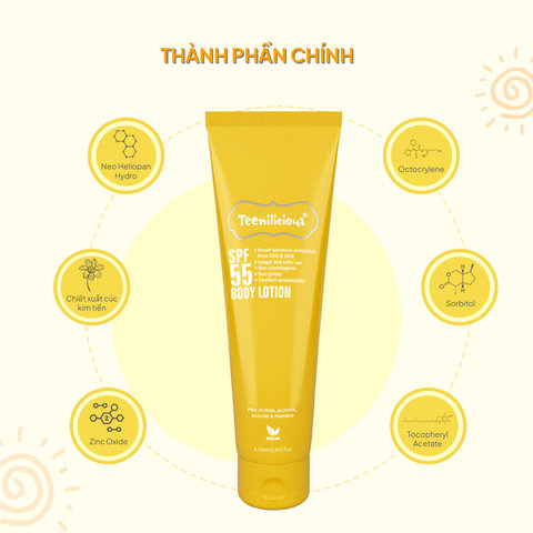 Sữa Dưỡng Thể Chống Nắng Teenilicious SPF55 Body Lotion giúp bảo vệ làn da khỏi tác hại của tia UVA, UVB từ ánh nắng mặt trời, cung cấp khả năng dưỡng ẩm hiệu quả, chống oxy hóa hoặc tế bào DNA hư hại do sự hình thành liên tục của oxy tái hoạt động. Sản phẩm dùng được cho cả da dầu mụn và da nhạy cảm.
