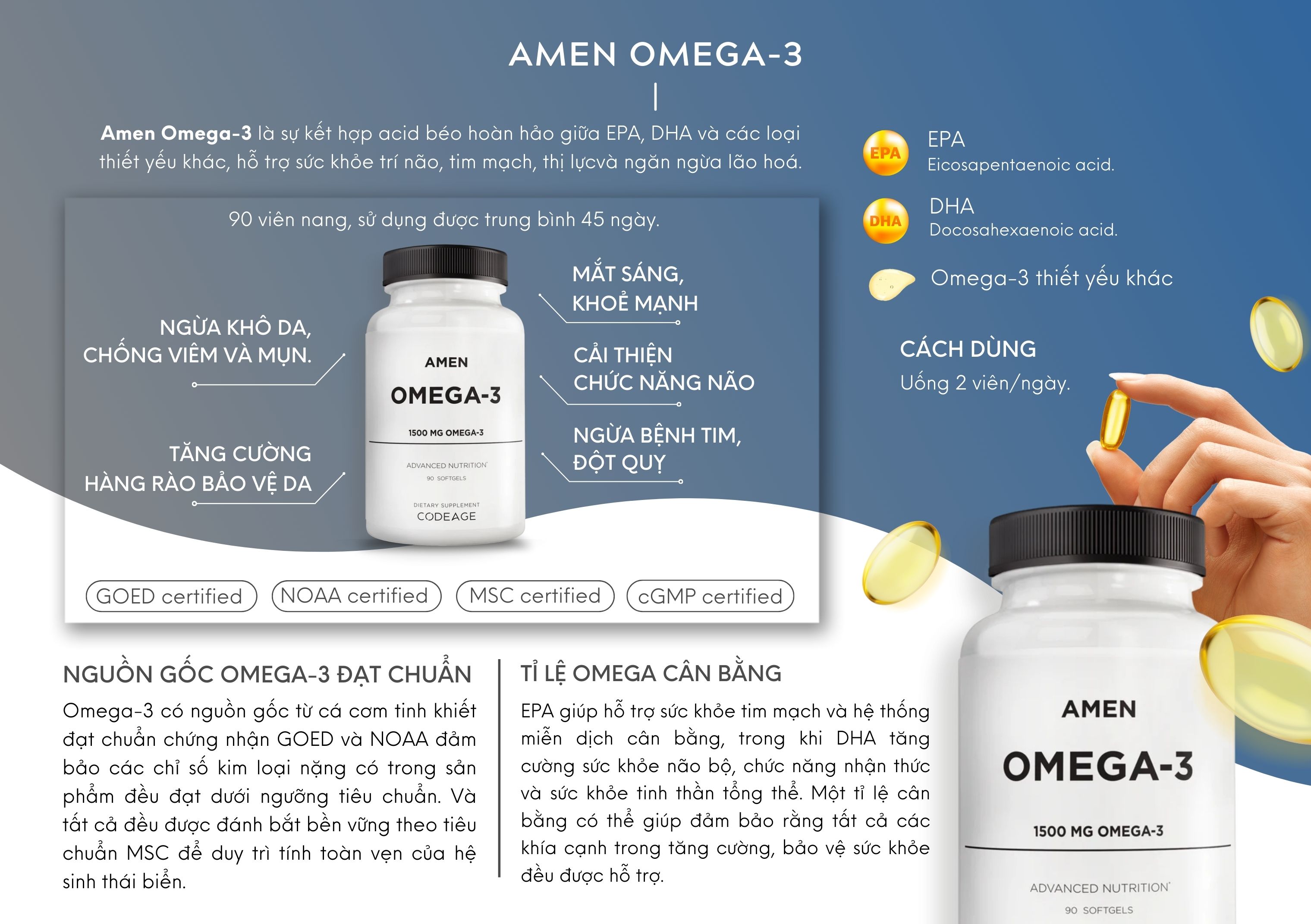- Amen Omega-3 bổ sung hàm lượng 1500mg Omega-3 mỗi khẩu phần. Cung cấp axit béo EPA, DHA và các axit béo thiết yếu khác để giúp hỗ trợ sức khỏe tim mạch và chức năng não.