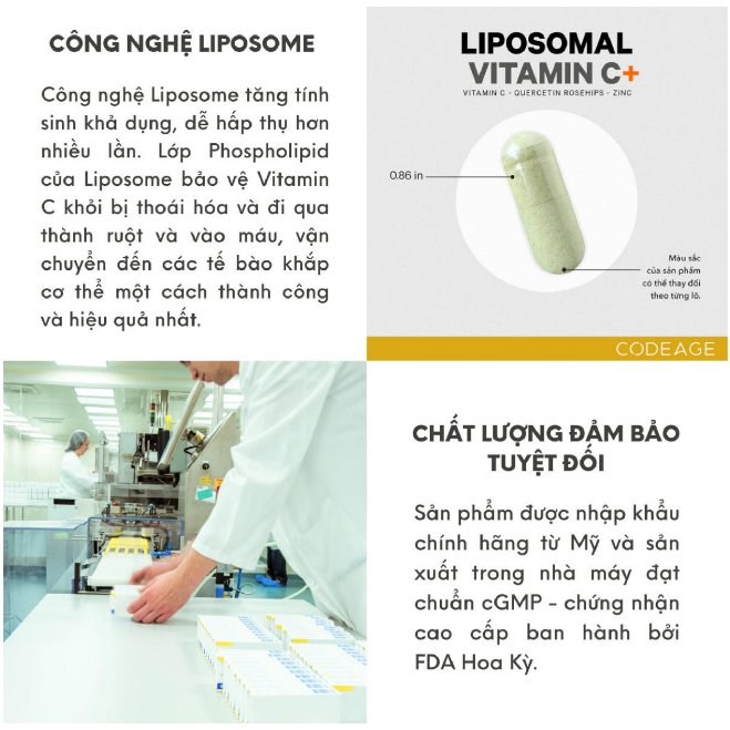 Viên CODE AGE LIPOSOMAL VITAMIN C cung cấp đầy đủ lượng Vitamin C cần thiết để cơ thể luôn khỏe mạnh, xây dựng nên hệ miễn dịch vững chắc. Bên cạnh đó còn có vai trò quan trọng trong việc thúc đẩy quá trình sản xuất Collagen cho da và cơ thể mà bạn có thể đang thiếu hụt đi mỗi ngày.