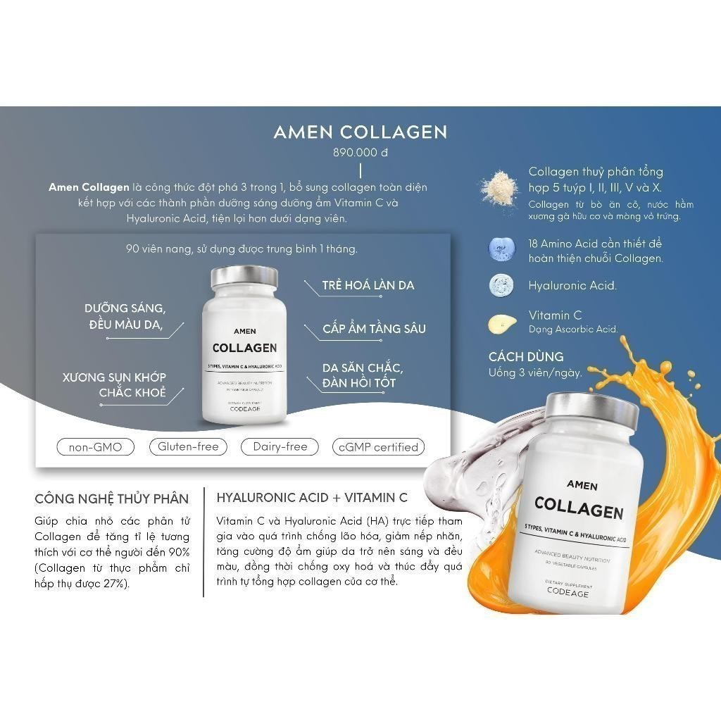 Viên uống Amen Collagen Codeage hỗ trợ da căng bóng, đàn hồi, mờ nám tàn nhang, đẩy lùi lão hóa 90 viên - Codeage Authorized MH
