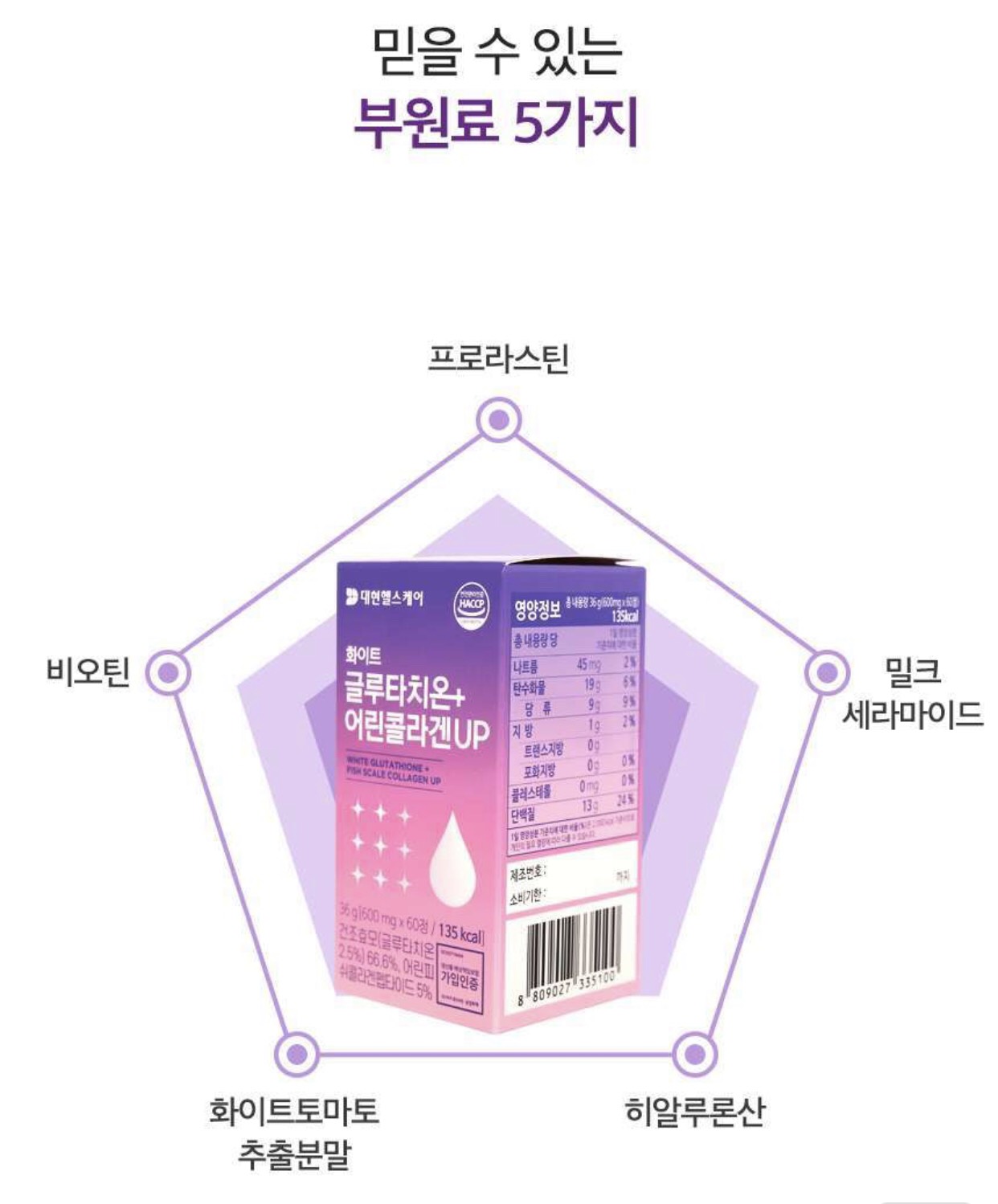 Collagen: 720 mg, Vitamin C: 600mg, Vitamin E: 300IU, Cao Cúc La mã: 174mg, Pregnenolon (Chiết xuất củ mài đáng): 180mg, Cao Sâm tố nữ: 150mg, Sữa ong chúa: 60mg, Chiết xuất Nhau thai cừu: 60mg, Bột Maca: 60mg, Glutathion: 16000mg, Evening Primrose oil: 30mg (Tinh dầu hoa anh thảo), Coenzym Q10: 6mg, Vitamin A: 6000IU, Kém gluconat: 60mcg, Biotin: 12mcg.