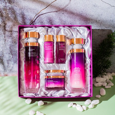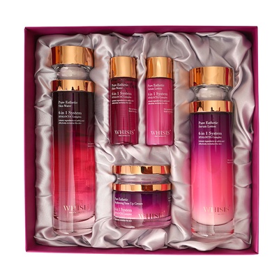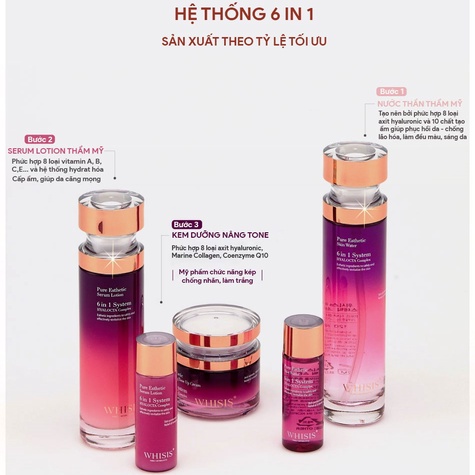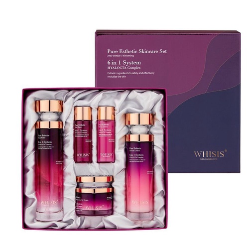 - Bộ dưỡng da chuyên sâu Whisis Pure Esthetic Skin Care Set gồm nước thần, tinh chất và kem dưỡng được sản xuất theo công thức độc quyền 6 in 1 giúp nuôi dưỡng, tái tạo và trẻ hóa làn da một cách hiệu quả.