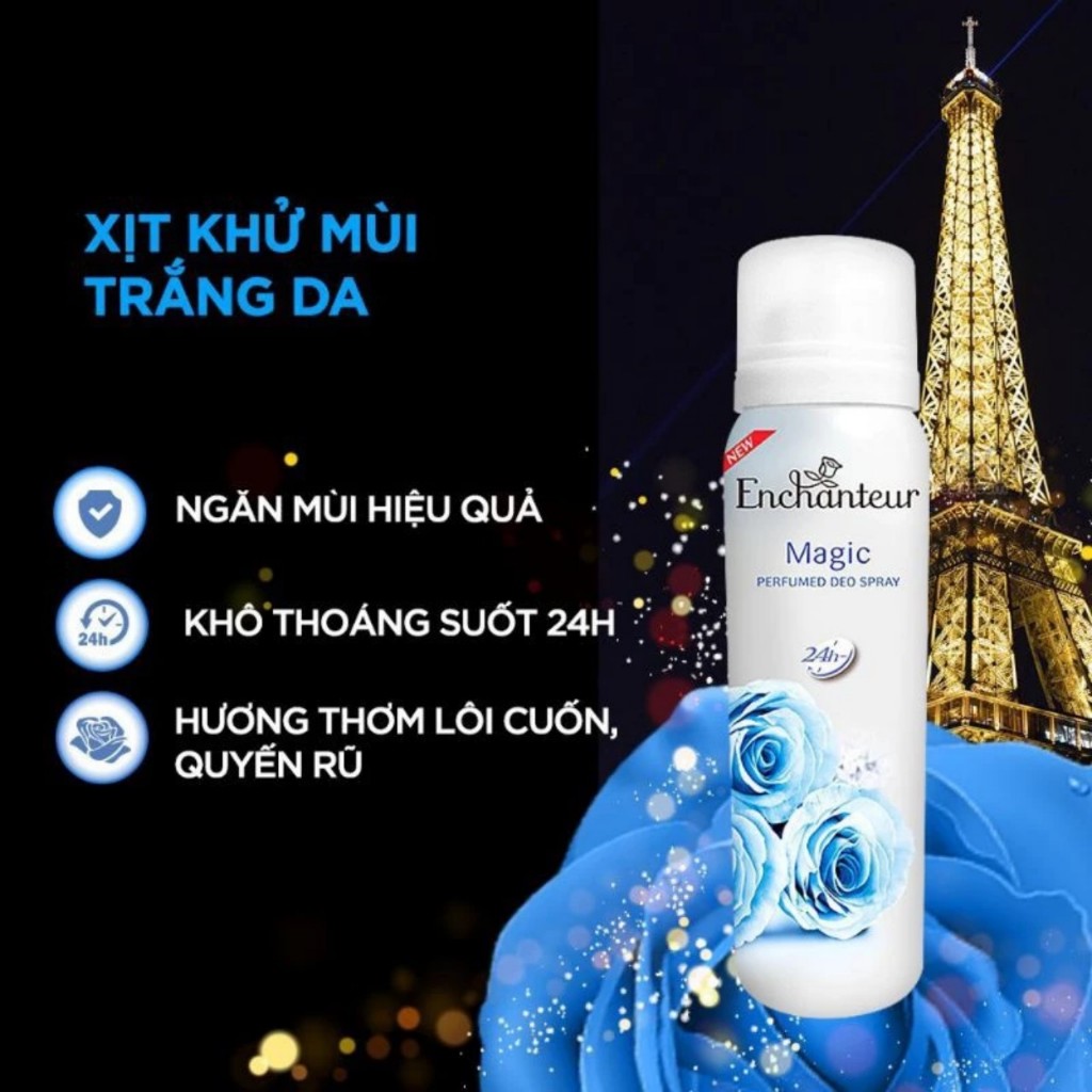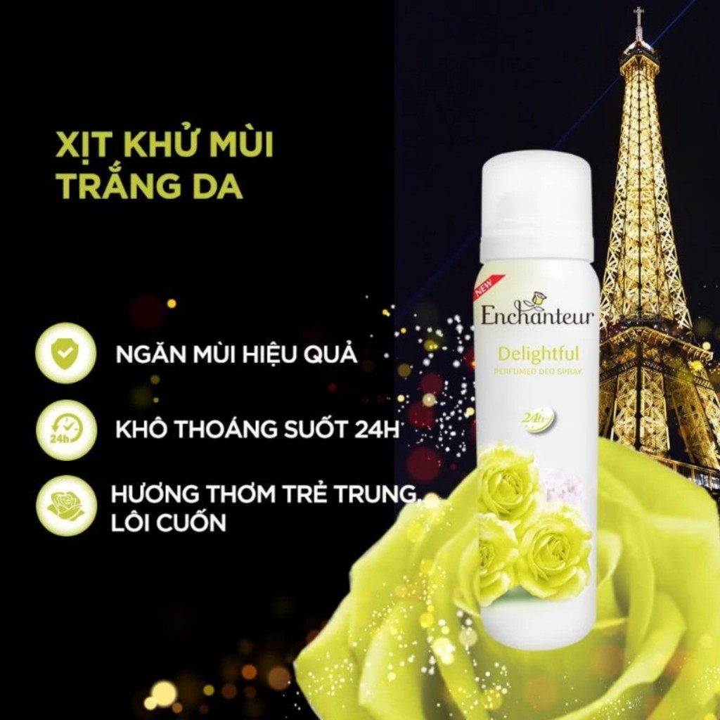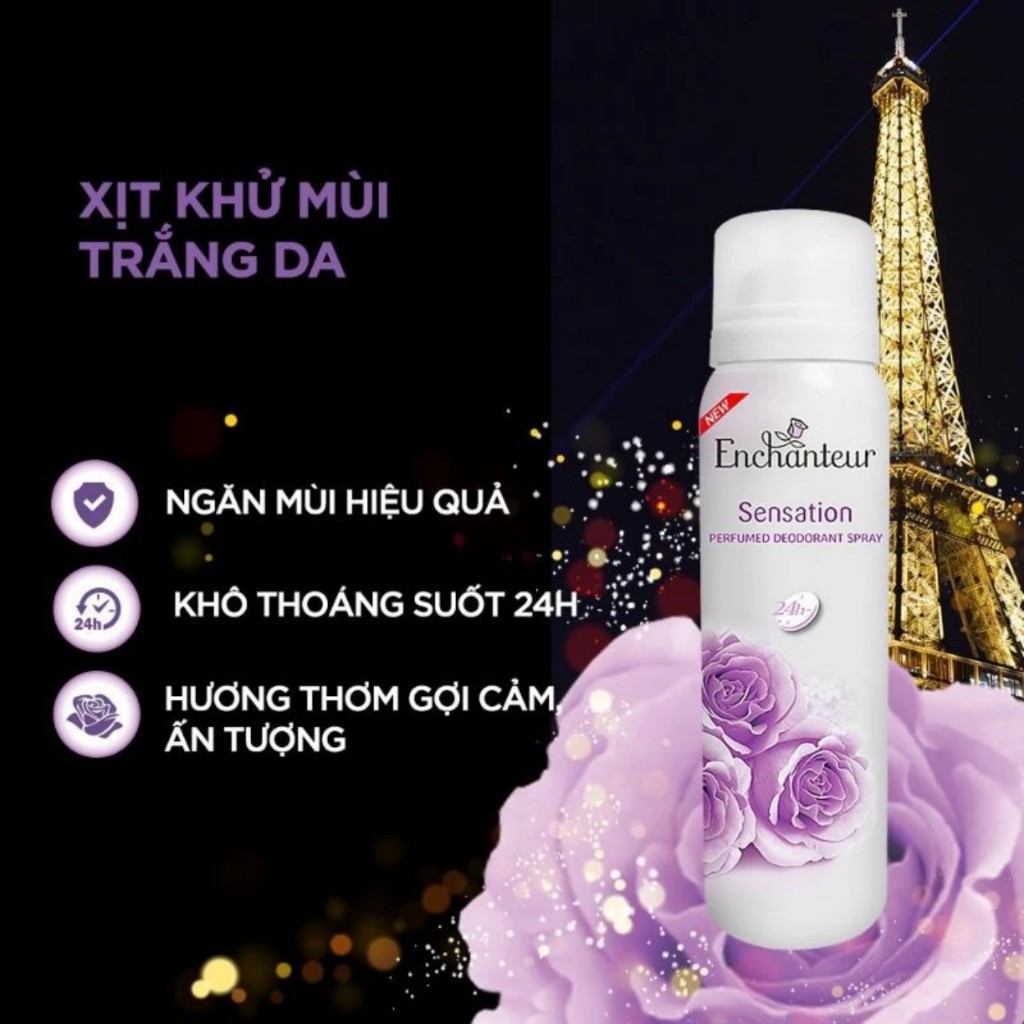 Xịt khử Mùi Enchanteur có hương thơm nồng nàn quyến rũ, là giải pháp tuyệt vời giúp bạn ngăn mùi hôi cơ thể. Hương thơm dịu mát, quyến rũ của nước hoa Pháp, cho bạn thêm tự tin mỗi khi ra ngoài. Thông tin sản phẩm -Hương thơm lãng mạn, quyến rũ -Xịt Khử Mùi Enchanteur Romantic có thành phần chiết xuất từ thiên nhiên và hương nước hoa Pháp nồng nàn, lưu lại mùi hương lãng mạn và cho vùng da dưới cánh tay luôn khô thoáng vượt trội suốt 24h. Chai dạng xịt tiện dụng -Thiết kế chai dạng xịt phun sương giúp dung dịch nhanh thẩm thấu và để lại hương thơm bề lâu, không để lại vệt trên quần áo. -An toàn cho da -Công thức chứa khoáng chất mang đến cho bạn cảm giác khô thoáng thật sảng khoái và ngăn mùi suốt 24giờ -Không chứa cồn, chất tạo màu, chất bảo quản, hoàn toàn an toàn cho da Hướng dẫn sử dụng -Lắc đều. Giữ chai thẳng đứng và để cách cơ thể hay vùng da dưới cánh tay 15cm khi xịt để có hiệu quả tốt nhất.