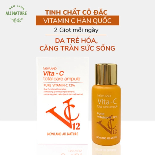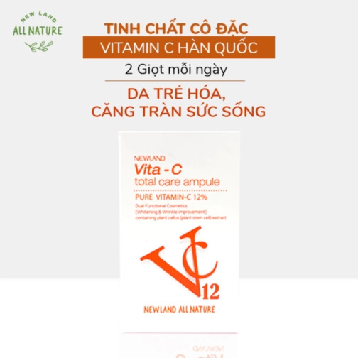 Tinh chất cô đặc dưỡng da trắng sáng Vita-C Total Care Ampule Newland có chứa hàm lượng 12 % vitamin C nguyên chất; thành phần “vitamin peptide” và chứa chiết xuất từ tế bào gốc thực vật có tác dụng kích hoạt các tế bào da giúp tế bào da luôn khỏe mạnh; ức chế sắc tố trên da hỗ trợ làm mờ các đốm nâu hoặc cải thiện vùng da ửng đỏ, giúp ngăn ngừa lão hóa, dưỡng sáng, làm đều màu da và cải thiện nếp nhăn.
