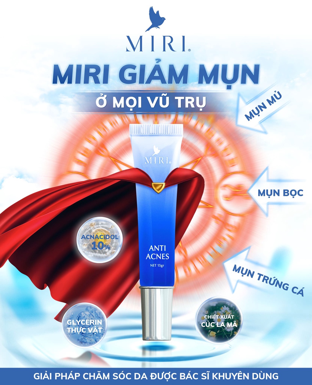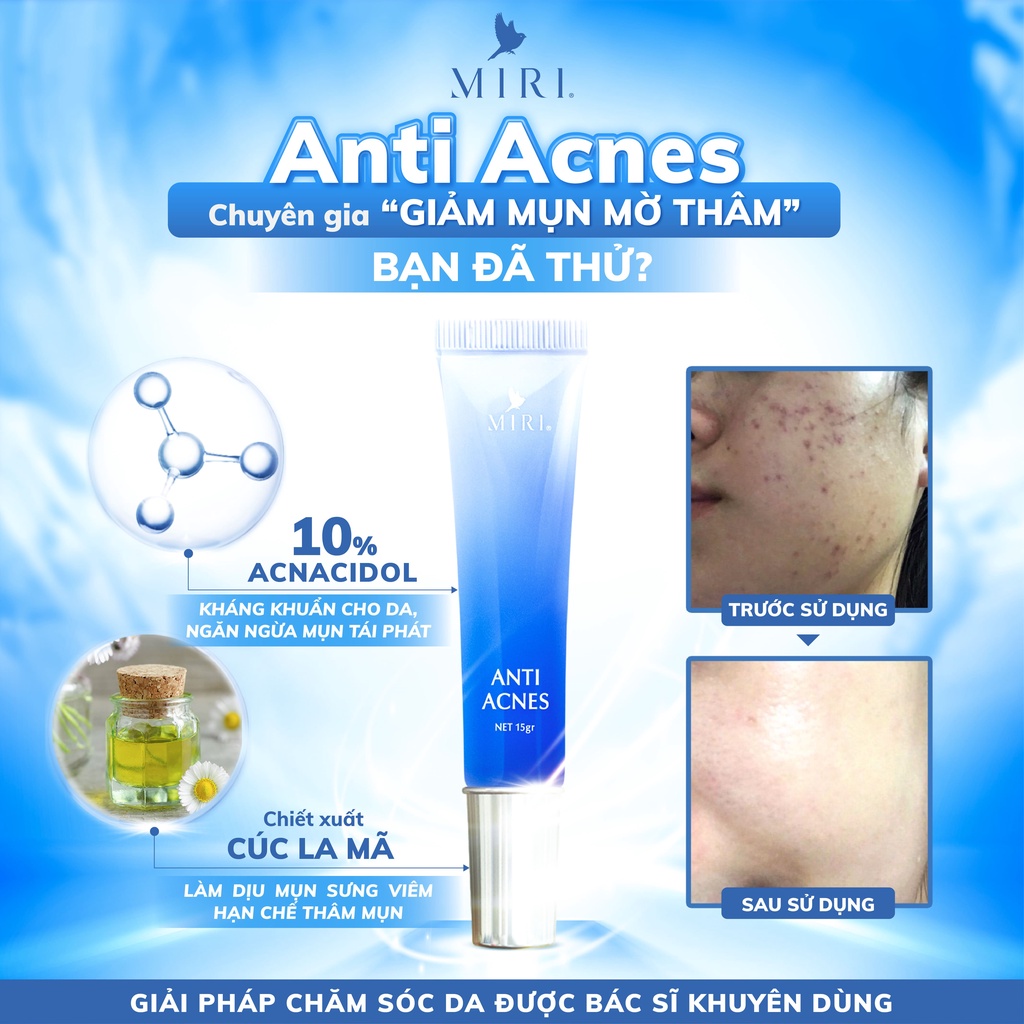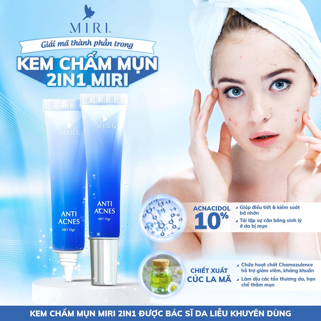 ANTI ACNES – Kem chấm mụn của MIRI là sản phẩm 2 in 1 được tạo ra để loại bỏ những nốt mụn cứng đầu trên da mặt và hạn chế tình trạng thâm mụn hiệu quả. Với thành phần nổi bật Acnacidol, Chamomilla Recutita. Kem chấm mụn MIRI hỗ trợ giảm tình trạng viêm tuyến bã, nấm, khuẩn, viêm làm dịu các tổn thương da, giúp tăng sinh tế bào mới cho da không bị thâm trên nền da cũ.