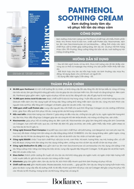 + Kem Dưỡng Panthenol Soothing Cream Bodiance giúp da mịn màng, làm sáng da, cải thiện da xỉn màu, cải thiện nếp nhăn li ti, độ đàn hồi, săn chắc của làn da mà không gây nhờn rít