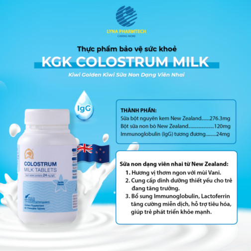 KGK Colostrum Milk Viên nhai sữa Non non bổ sung dinh dưỡng và miễn dịch với lượng IgG liều cao giúp miễn dịch khoẻ, tiêu hoá tốt.