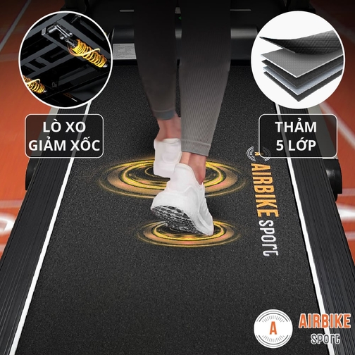 - Ngoài ra, máy chạy bộ Airbike còn có 4 miếng đệm giảm chấn thương bằng cao su giúp giảm lực tác động lên chân giúp tăng hiệu quả tập luyện và tăng sự độ bền cho máy.