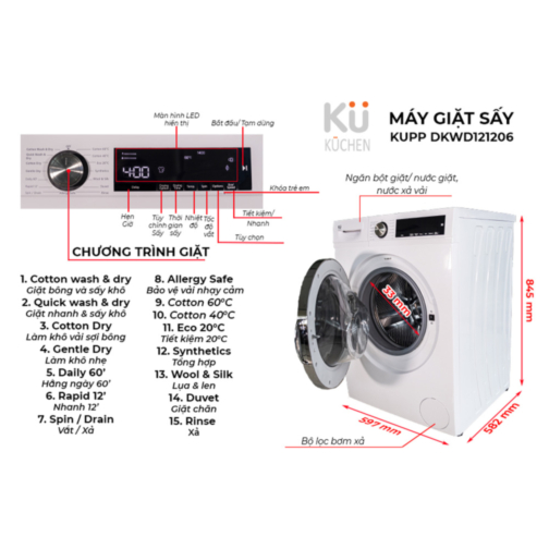 Trang bị 15 chương trình giặt-sấy đặc biệt, đáp ứng tiêu chuẩn giặt cho nhiều loại vải khác nhau gồm: