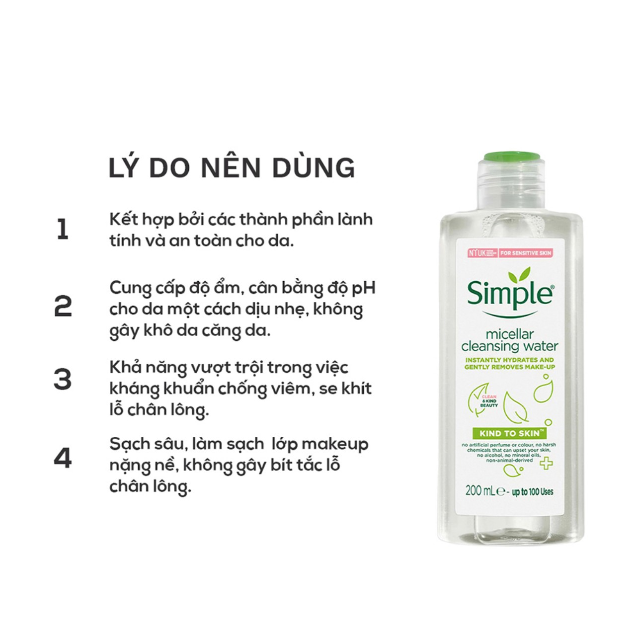 Được mệnh danh là "best seller" của Simple kể từ khi ra mắt nhờ vào khả năng làm sạch, loại bỏ mọi bụi bẩn bã nhờn cùng lớp makeup mà không gây kích ứng da, kể cả những vùng da nhạy cảm như mắt và môi. Mang đến cho bạn làn da tươi mới, thông thoáng lỗ chân lông và tràn đầy sức sống.