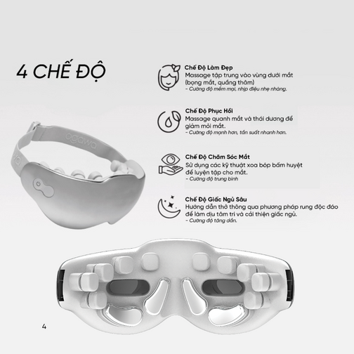 • Chế độ phục hồi: Massage quanh mắt và thái dương để giảm mỏi mắt. Cường độ mạnh hơn, tần suất nhanh hơn.