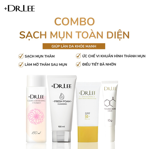 Combo Sạch Mụn Toàn Diện + Dr.lee là lựa chọn hoàn hảo để làm sạch làn da đang bị tổn thương do mụn. Với công thức kết hợp thành phần chiết xuất có nguồn gốc tự nhiên, giàu dưỡng chất và dịu nhẹ khi dùng trên làn da. Bộ sản phẩm giúp loại bỏ tạp chất sâu trong lỗ chân lông; đồng thời điều tiết bã nhờn hiệu quả, hỗ trợ đắc lực cho quá trình ức chế, giảm và xóa làn da mụn hiệu quả.